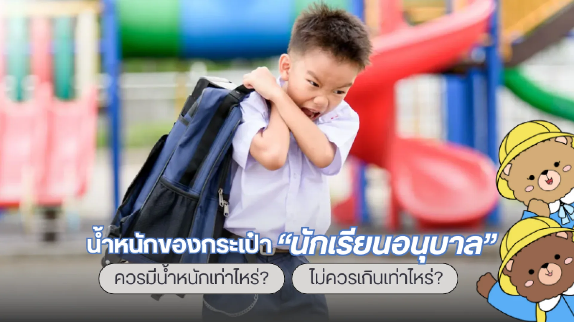 - เด็กน้ำหนัก 20 กิโลกรัม → กระเป๋าไม่ควรเกิน 2–3 กิโลกรัม
